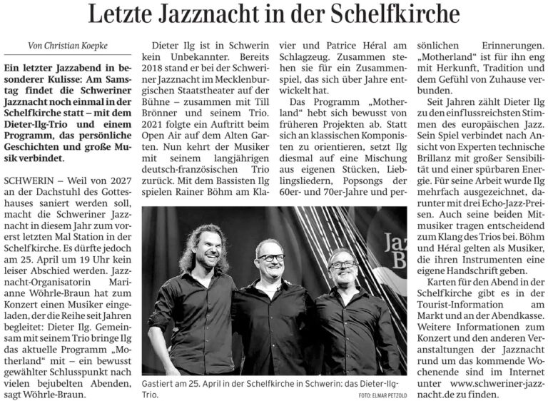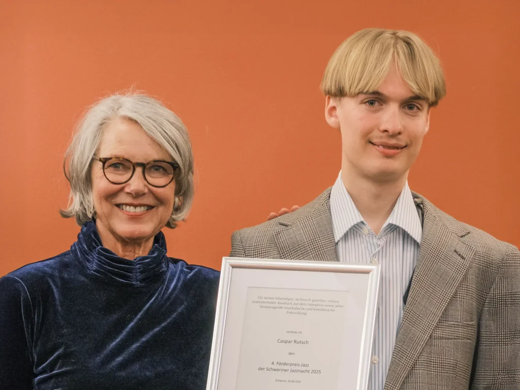 Der Förderpreis Jazz, 2022 initiiert von Marianne Wöhrle-Braun, Organisatorin der Schweriner Jazznacht, ist mit 3.000 € dotiert, und wird im Jahr 2026 zum 5. Mal ausgelobt. Bewerbungsende/Stichtag: Mittwoch, der 11. März 2026. Alle Bewerbungen werden berücksichtigt. Bitte die Bewerbung mit einem einzigen WeTransfer-Link per E-Mail senden.